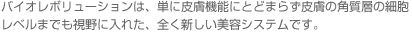 太陽光は、古代から用いられ、現在では美容の分野でさまざまに活用されています。バイオレボリューションは、屈折させると分光して目に見える可視光と、可視光の赤よりも外側にある赤外光の光子エネルギーを、特殊偏光レンズにより透過性を高め、理想的な状態で照射。短い波長の光刺激と長い波長の刺激が、皮膚に深く角質層等をいたわり、皮膚の調子をととのえ、皮膚を生き生きとさせます。