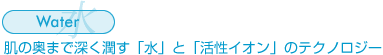 | すべての生命を育む水、人間の体は全体の60〜70%が水で構成されています。水分が失われると肌に影響します。ピュアウェーブウォーターは、クラスターの細かい水を特殊な処理によりイオン化して浸透を良くし、皮膚を潤します。さらに、約6,000倍もの水を保有するヒアルロン酸の配合により、一層効果的に保水作用を高め弾力ある皮膚に導きます。 |